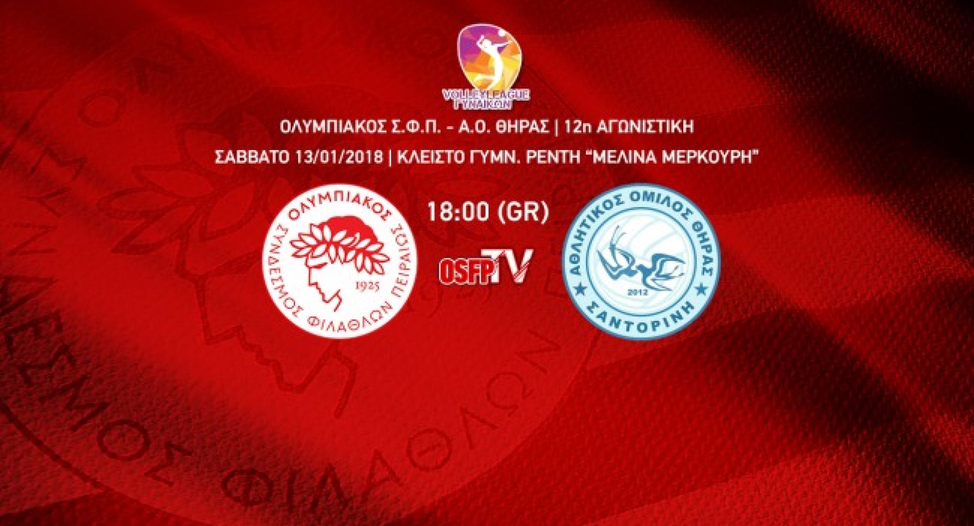 Παρακολουθήστε ζωντανά απο το κλειστό γυμναστήριο Ρέντη "Μελίνα Μερκούρη" την αναμέτρηση Ολυμπιακός Σ.Φ.Π. - Α.Ο. Θήρας για την 12η αγωνιστική της Volleyleague Γυναικών.