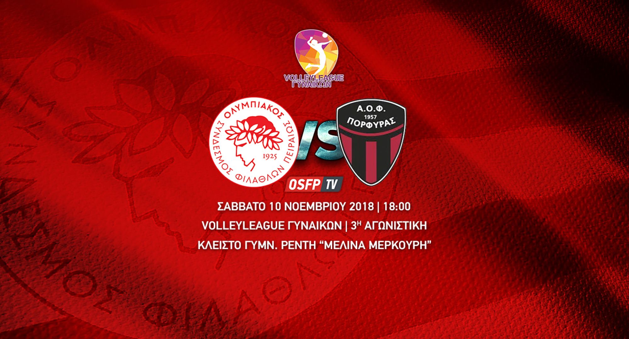 Παρακολουθήστε ζωντανά το Σάββατο στις 18:00, τον αγώνα του Ολυμπιακού με τον Πορφύρα για την 3η αγωνιστική της Volleyleague Γυναικών, απο το OSFP TV!