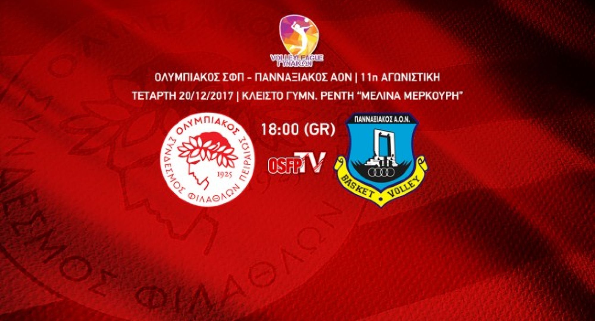 Παρακολουθήστε ζωντανά απο το OSFP TV την αναμέτρηση Ολυμπιακός Σ.Φ.Π. - Πανναξιακός Α.Ο.Ν. για την 11η Αγωνιστική της Volleyleague Γυναικών