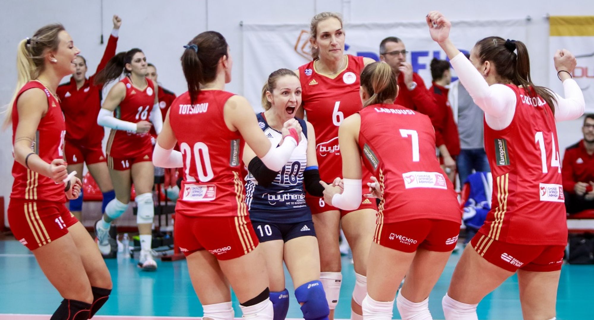 Ο Ολυμπιακός, που παρατάχθηκε με τις Σκοτ, Λαμπρούση, Χριστοδούλου, Χίπε, Ζακχαίου, Τοτσίδου και λίμπερο την Κακουράτου, μπήκε δυναμικά στην αναμέτρση. Οι «ερυθρόλευκες» προηγήθηκαν με 3-0, πιέζοντας από το σερβίς. Στο 12-10 οι παίκτριες του Μπράνκο Κοβάτσεβιτς με ένα σερί 2-0, έφτασαν τη διαφορά στο συν τέσσερα (14-10), διατηρώντας τον έλεγχο. Οι φιλοξενούμενες μείωσαν αρχικά σε 15-14 και στη συνέχεια το σετ ήρθε στα ίσα στο 15-15. Η Χίπε κάρφωσε και ο Ολυμπιακός πέρασε εκ νέου μπροστά με 16-15. Συν τρία για τον Ολυμπιακό με μπλοκ της Ζακχαίου για το 20-17 και άσσος της Λαμπρούση διαμορφώνει το 21-17. Η Σκοτ περνάει έξυπνα την μπάλα στο αντίπαλο τερέν, για το 23-19 και σετ μπολ από τη Ζακχαίου, στη μεγαλύτερη σε διάρκεια φάση του αγώνα (24-20). Η Τοτσίδου τελειώνει το σετ, για το 25-20 και το 1-0 του Ολυμπιακού στον αγώνα.