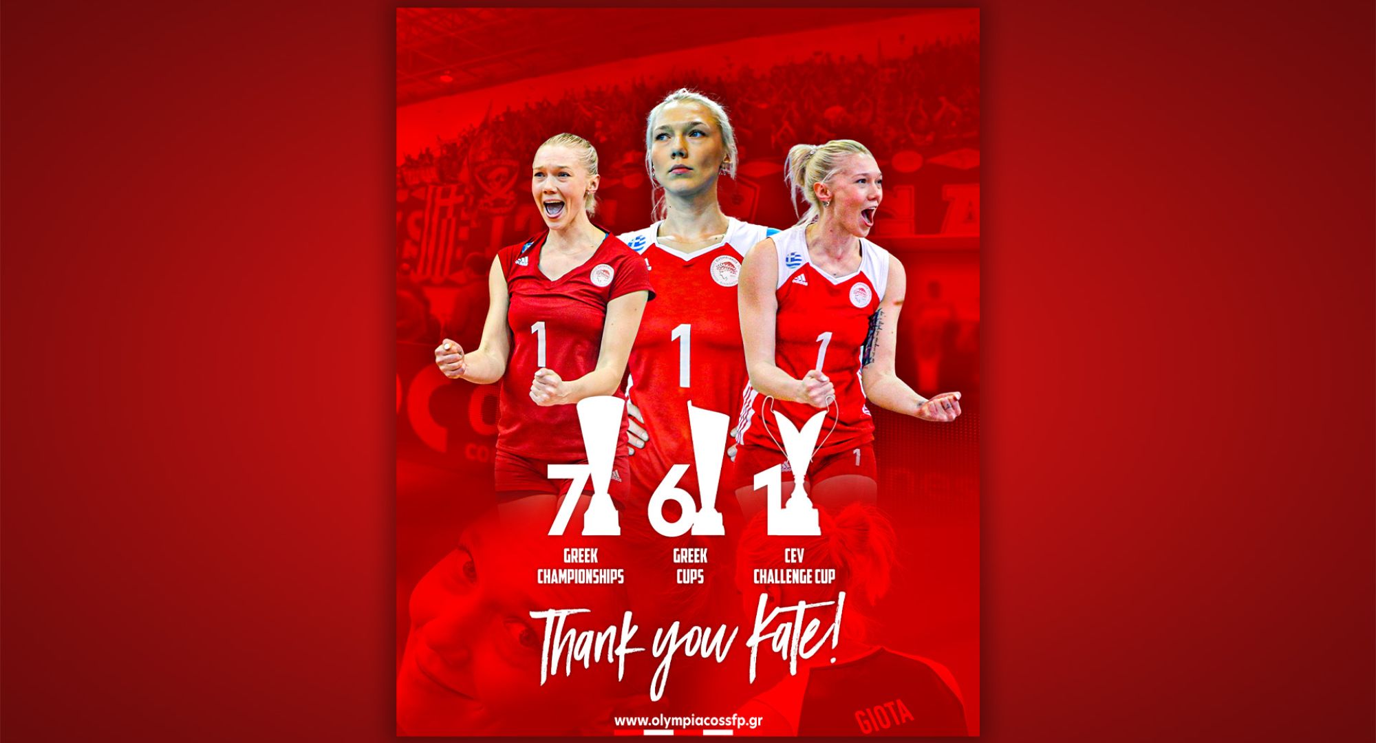 Το καλοκαίρι του 2013, σε ηλικία 23 ετών, «κατηφόρισε» από την Κηφισιά στο Ρέντη. Με ένα μεγάλο χαμόγελο, η Κατερίνα Γιώτα εντάχθηκε στην ομάδα βόλεϊ Γυναικών του Ολυμπιακού. Και έτσι ολοκλήρωσε τη «θητεία» της στον Θρύλο. «Γεμάτη». Περήφανη. Δεν είναι και... λίγα τα όσα πέτυχε φορώντας την ερυθρόλευκη φανέλα. Επτά πρωταθλήματα, έξι Κύπελλα, ένα ευρωπαϊκό, το Challenge Cup του 2018. Σε 10 χρόνια στο σύλλογο μας, η Κατερίνα κατέκτησε συνολικά 14 τρόπαια!