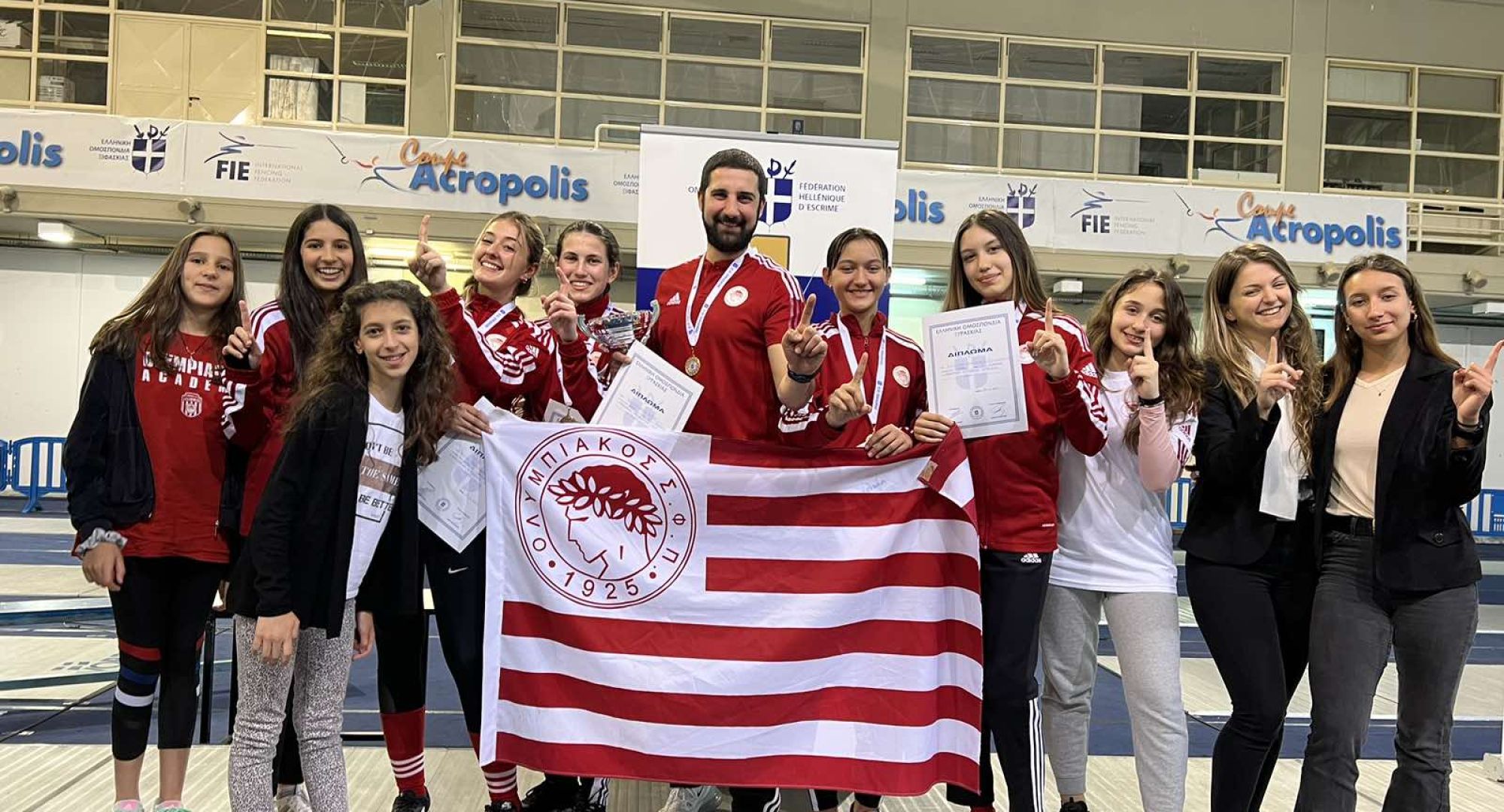 Πρωταθλήτριες Ελλάδος αναδείχθηκαν οι Νεάνιδες της Ακαδημίας Ξιφασκίας του Ολυμπιακού, οι οποίες την Κυριακή (23/4) κατέκτησαν την κορυφή στην κατηγορία του ομαδικού στο Πανελλήνιο Πρωτάθλημα Εφήβων-Νεανίδων του ΟΑΚΑ. Η Χριστίνα Χουζούρη, η Αργυρώ Τσοκαροπούλου, η Εβίτα Καβέλη και η Αναστασία Φραγκοπούλου αποτέλεσαν την «ερυθρόλευκη» τετράδα που επέλεξε κυριολεκτικά την τελευταία στιγμή ο υπεύθυνος της ομάδας, Γιώργος Τσουρούτας, με τα κορίτσια να δικαιώνουν με τον καλύτερο τρόπο τον εορτάζοντα προπονητή τους. Στον δρόμο για την κορυφή, ο Ολυμπιακός απέκλεισε στα προημιτελικά με σχετική άνεση την ομάδα της ΑΕΚ (45-11), ενώ στα ημιτελικά επικράτησε επί του Απόλλωνα Βριλησσίων με 45-30. Στη «μάχη» για το χρυσό, οι «ερυθρόλευκες» αντιμετώπισαν τα Εκπαιδευτήρια Κωστέα Γείτονα και μετά από έναν συναρπαστικό τελικό πήραν τη νίκη με 45-40 και με αναδείχθηκαν πρωταθλήτριες Ελλάδος.
