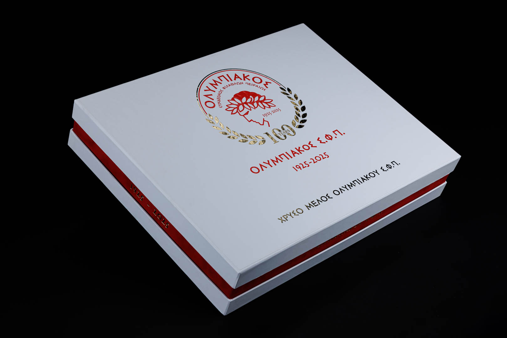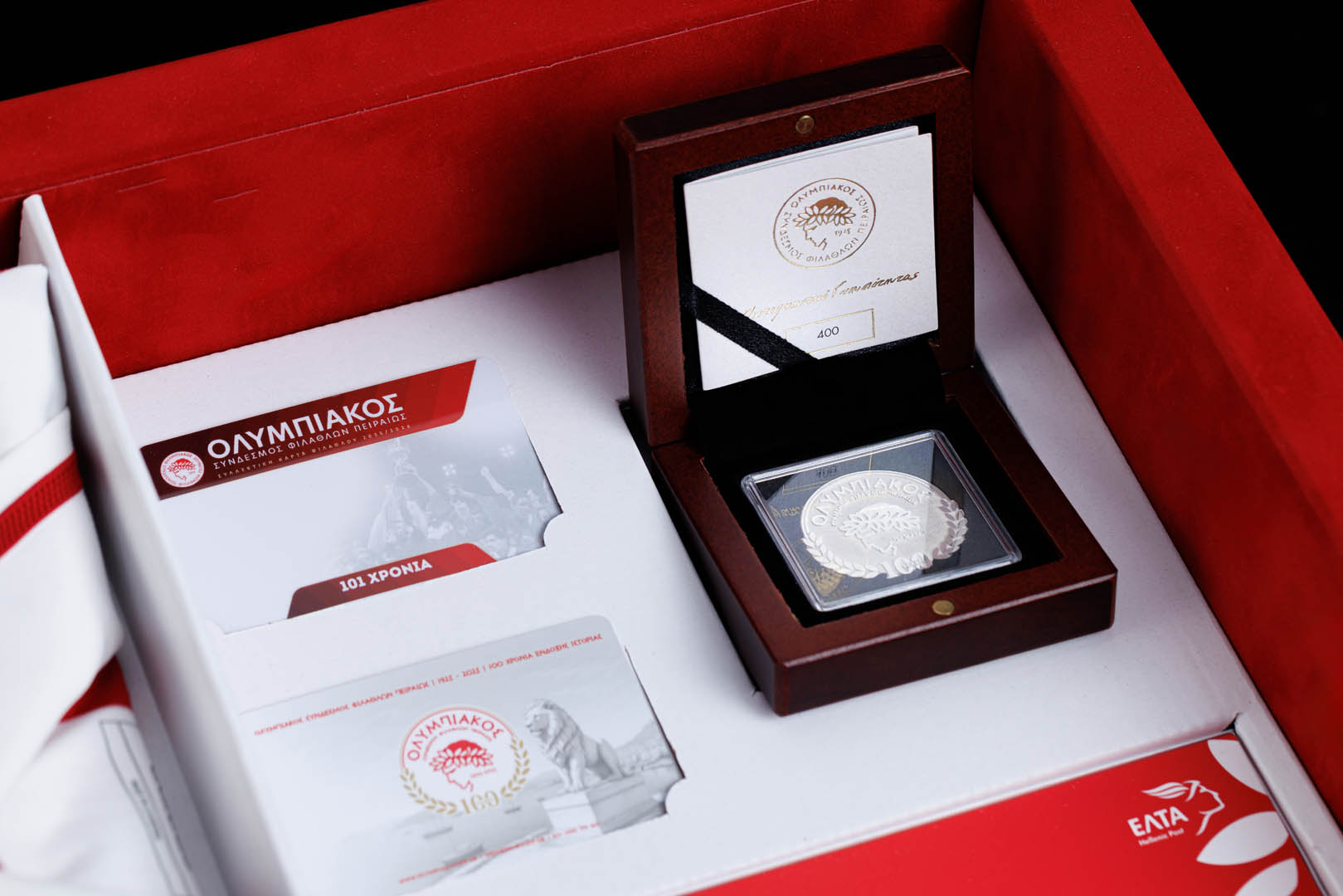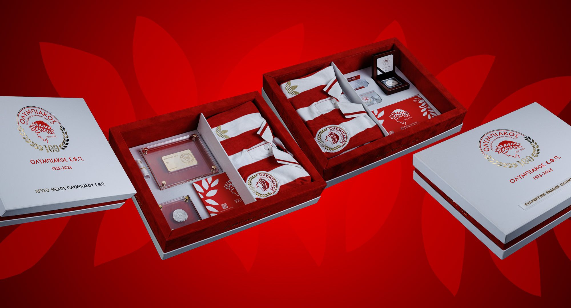 Ένα ολοκληρωμένο επετειακό σύνολο, που αποτελεί ξεχωριστό ενθύμιο της ιστορικής χρονιάς του Ολυμπιακού, στην τιμή των 5.000 ευρώ.